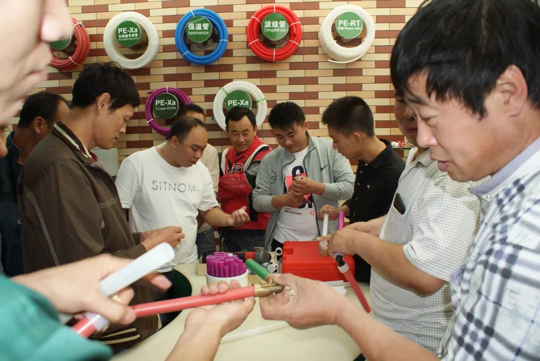 中国·350vip8888新葡的京1+事业部产品工程师依工详尽介绍了中国·350vip8888新葡的京1+的产品技术以及应用知识,着重讲解了pe-xa的施工工艺、PVC快修管件及其它配套产品的应用,现场通过实物实例,充分地展示了中国·350vip8888新葡的京1+产品的技术先进性和质量可靠性。