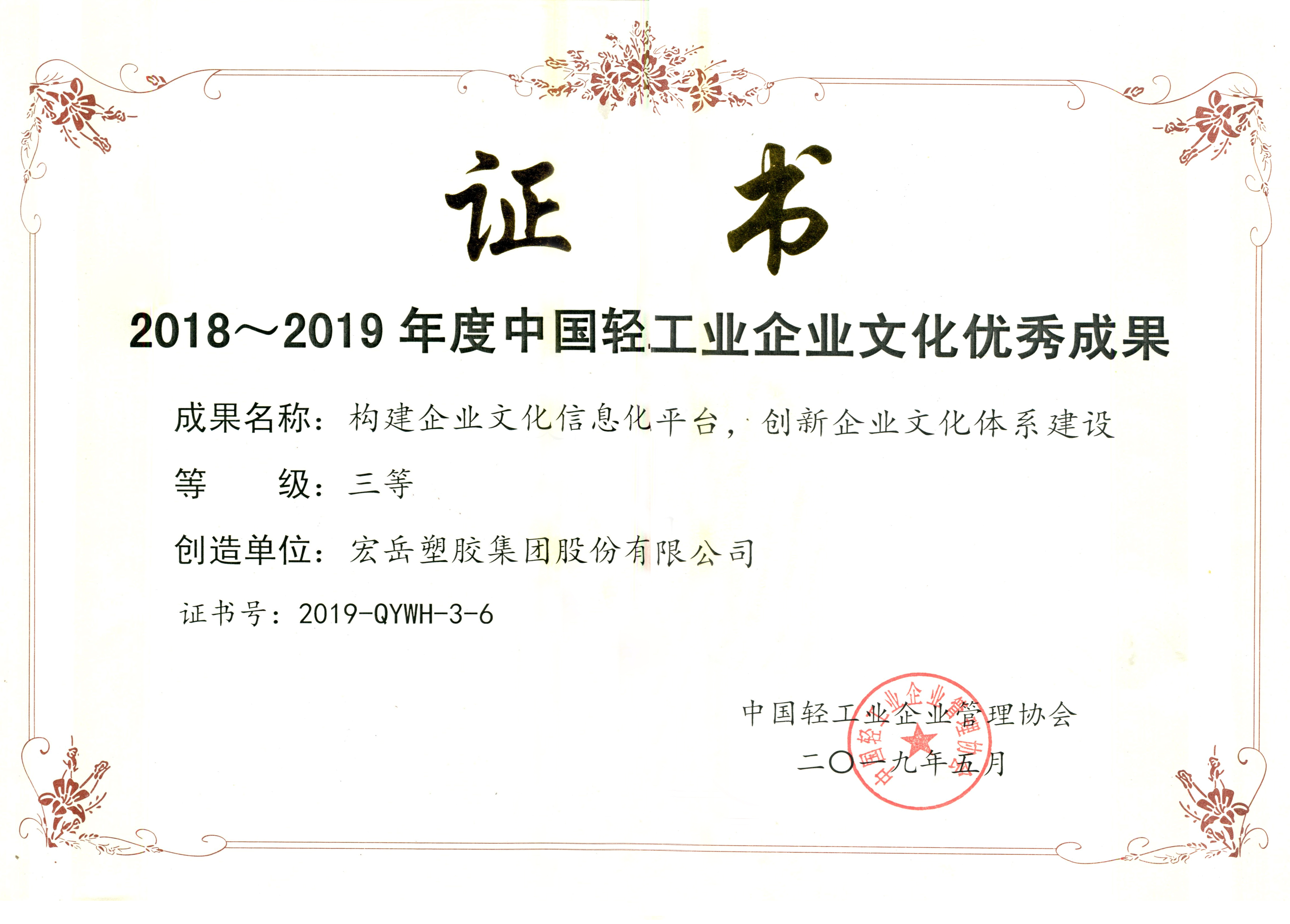 5月17日,中国轻工业企业管理协会第四届第五次理事(扩大)会议暨2019年轻工业企业文化建设经验交流会在郑州召开,中国·350vip8888新葡的京集团申报的“构建企业文化信息化平台,创新企业文化体系建设”项目成果荣获2018~2019年度中国轻工行业企业文化优秀成果三等奖。